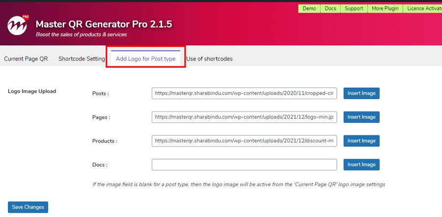 we have set different logos based on post type. If the image field is blank for a post type, then the logo image will be active from the ‘Current Page QR’ logo image settings. see the Docs